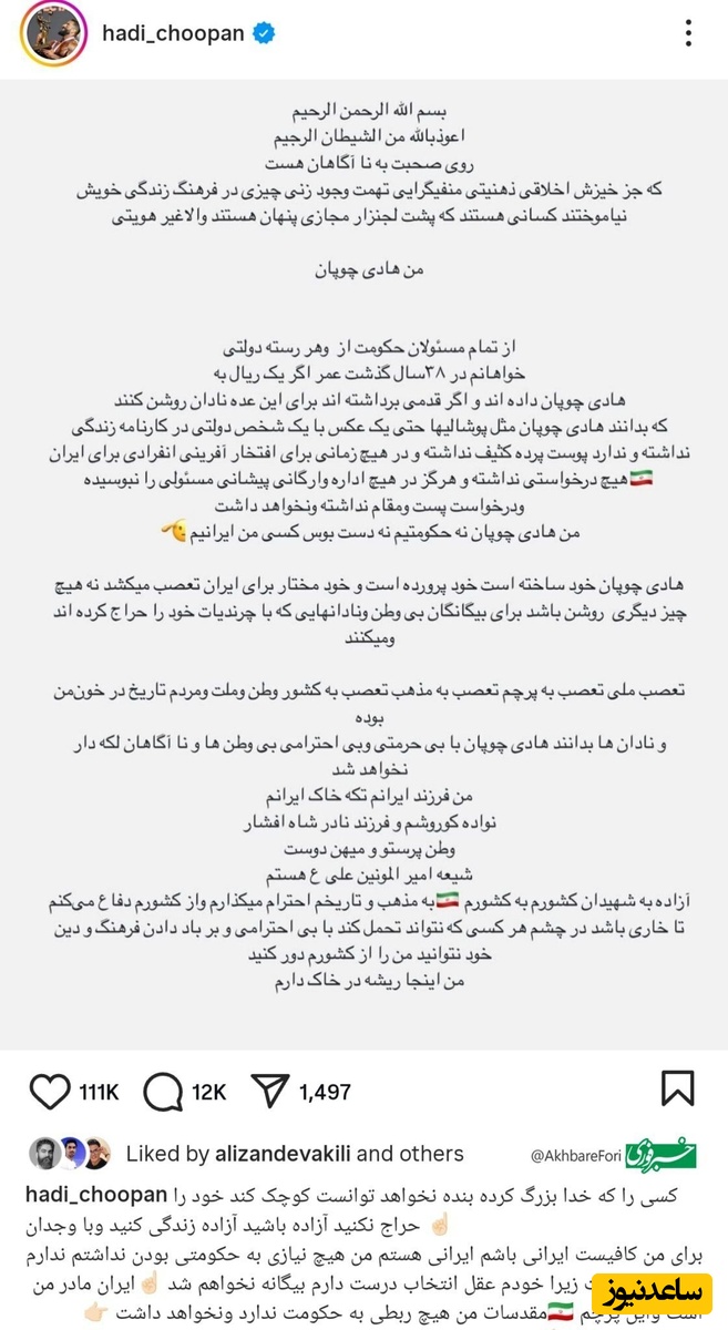 به گزارش سرویس ورزش ساعدنیوز، هادی چوپان در اینستاگرام خود استوری معناداری منتشر کرد که واکنش کاربران را در پی داشته است.