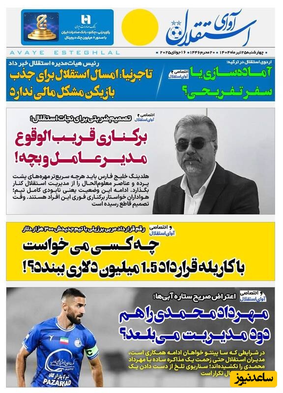 ساعدنیوز: در روز چهارشنبه 25 تیر 1404، روزنامه‌های کشور با عناوین مختلف به مهم‌ترین رویدادهای ورزشی، اجتماعی و سیاسی پرداخته‌اند. از تحولات جدید در عرصه‌های مختلف تا واکنش‌ها به اتفاقات روز، این عناوین نمایانگر دغدغه‌های جامعه در این روزها هستند.