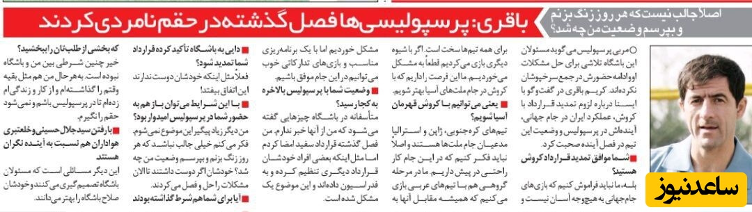 - ظاهرا خودشان دوست ندارند قرارداد من با پرسپولیس برای لیگ چهاردهم تمدید شود. البته دیگر زیاد پیگیر این موضوع نمیشوم چون فکر میکنم خیلی جالب نباشد که هر روز زنگ بزنم و بپرسم وضعیتم چه شد. آقایان اگر دوست داشتند، تا الان مشکل را حل کرده بودند.