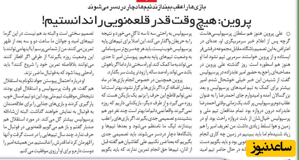 پروین طی مصاحبهای که 26 تیر سال 91 در خبر ورزشی نیز منتشر شد، ضمن تشریح فضای پرسپولیس در آن روزها، قاطعانه از امیر قلعه نویی هم حمایت کرد. بد نیست به خلاصه این گفتگو دوباره نگاه بیندازیم: