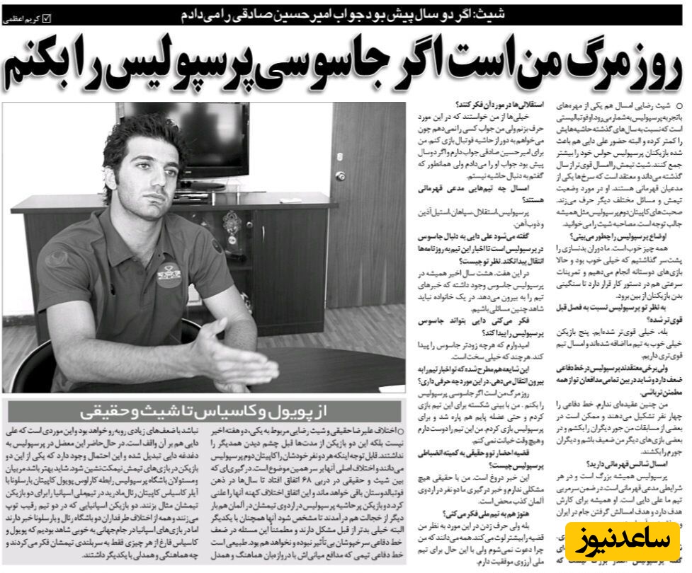 - روز مرگ من است اگر جاسوسی پرسپولیس را بکنم. شیث رضایی با بینی شکسته و عضله پاره برای این تیم بازی کرد و هیچوقت به پرسپولیس خیانت نمیکند.