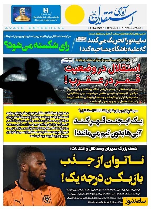 ساعدنیوز: در روز شنبه 4 مرداد 1404، روزنامه‌های کشور با عناوین مختلف به مهم‌ترین رویدادهای ورزشی، اجتماعی و سیاسی پرداخته‌اند. از تحولات جدید در عرصه‌های مختلف تا واکنش‌ها به اتفاقات روز، این عناوین نمایانگر دغدغه‌های جامعه در این روزها هستند.