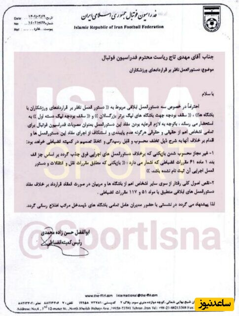 ریاست کمیته انضباطی در نامه رسمی به فدراسیون فوتبال درباره دستورالعمل ناظر بر قراردادهای ورزشکاران ذکر کرده: بازیکنی که بر خلاف دستورالعمل های اجرایی فوق جذب گردد، غیر مجاز محسوب میشود. به عبارتی زمانی که قراداد داخلی بسته شده در سازمان لیگ ثبت نشود، استفاده از آن بازیکن مجاز نیست.