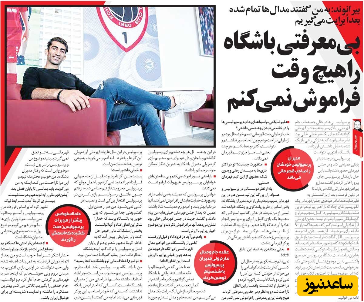 اگر نامرد بودم قبل از جام جهانی قراردادم را تمدید نمیکردم یا همان موقع که پرسپولیس محروم شد، از این تیم جدا میشدم اما به عشق پرسپولیس ماندم. جالب اینجاست که میگویند آپشنهای قهرمانی لیگ نوزدهم به تو تعلق نمیگیرد. موضوع من پول نیست بلکه رفتار مدیران باشگاه ناراحتم میکند رفتاری که خوب و محترمانه نبود.