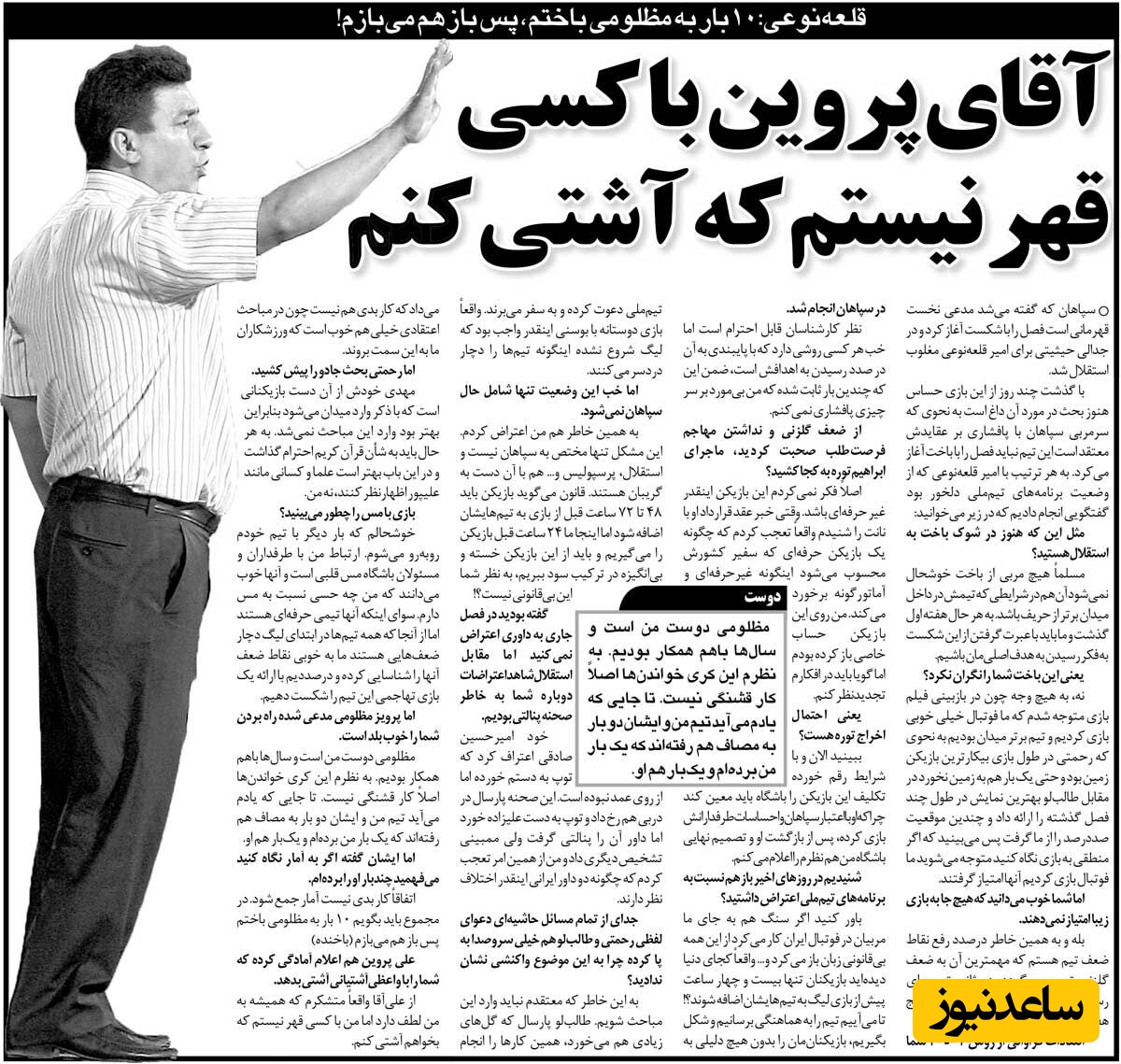 علیآقای پروین گفته که آمادگی دارد من را با آقای واعظ آشتیانی (مدیرعامل وقت استقلال) آشتی بدهد؟ از پروین متشکرم چون همیشه به من لطف دارد اما با کسی قهر نیستم که بخواهم آشتی کنم.