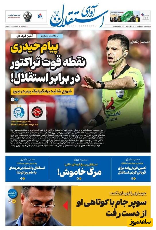 ساعدنیوز: در روز سه‌شنبه 28 مرداد 1404، روزنامه‌های کشور با عناوین مختلف به مهم‌ترین رویدادهای ورزشی، اجتماعی و سیاسی پرداخته‌اند. از تحولات جدید در عرصه‌های مختلف تا واکنش‌ها به اتفاقات روز، این عناوین نمایانگر دغدغه‌های جامعه در این روزها هستند.