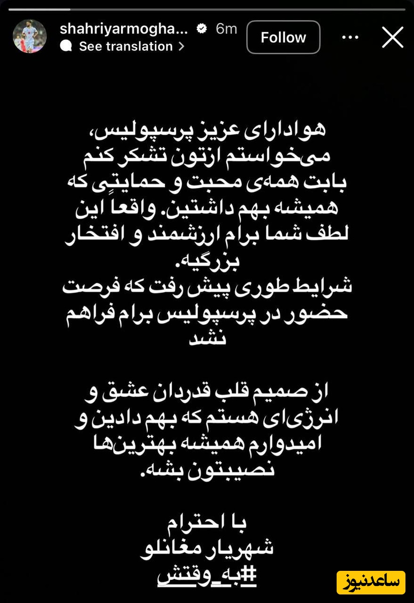 اکنون مغانلو با انتشار پیامی احساسی در اینستاگرام به منتفی شدن انتقالش به پرسپولیس واکنش نشان داده و نوشته است: هوادارای عزیز پرسپولیس میخواستم ازتون تشکر کنم بابت همه محبت و حمایتی که همیشه بهم داشتین واقعا این لطف شما برام ارزشمند و افتخار بزرگیه. شرایط طوری پیش رفت که فرصت حضور در پرسپولیس برام فراهم نشد. از صمیم قلب قدردان عشق و انرژی ای هستم که بهم دادین و امیدوارم همیشه بهترینها نصیبتون بشه...با احترام شهریار مغانلو #به_وقتش