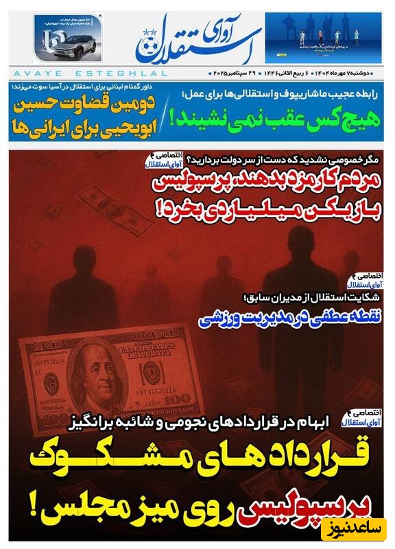 ساعدنیوز: در روز دوشنبه 7 مهر 1404، روزنامه‌های کشور با عناوین مختلف به مهم‌ترین رویدادهای ورزشی، اجتماعی و سیاسی پرداخته‌اند. از تحولات جدید در عرصه‌های مختلف تا واکنش‌ها به اتفاقات روز، این عناوین نمایانگر دغدغه‌های جامعه در این روزها هستند.