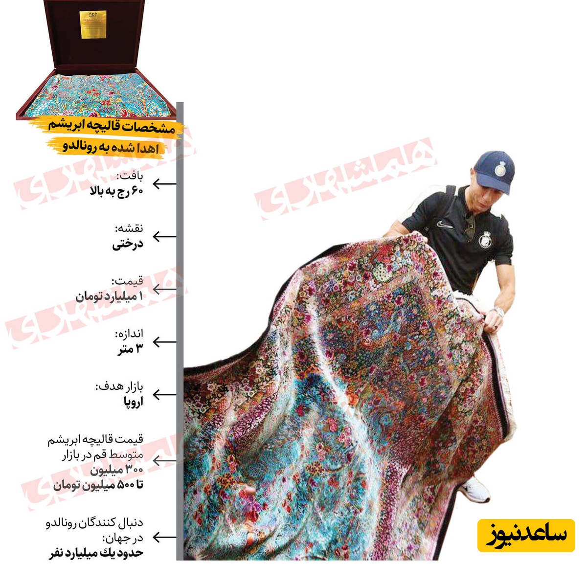 به گزارش سرویس ورزش ساعدنیوز، مدتها پیش رونالدو کمتر از 48 ساعت در ایران ماند و هدیهای که او را در بدو ورود به ایران به وجد آورد، فرش ابریشم ایرانی بود که از جانب فرزند یکی از مهمترین صادرکنندگان مطرح فرش دستباف ایران به اروپا به اسطوره فوتبال جهان پیشکش شد.