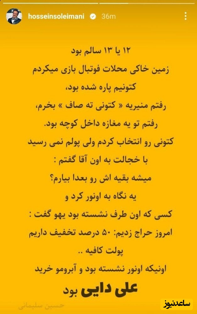 به گزارش سرویس ورزش ساعدنیوز، حسین سلیمانی بازیگر سینما و تلویزیون با انتشار یک استوری در اینستاگرامش خاطره جالبی از علی دایی منتشر کرد.