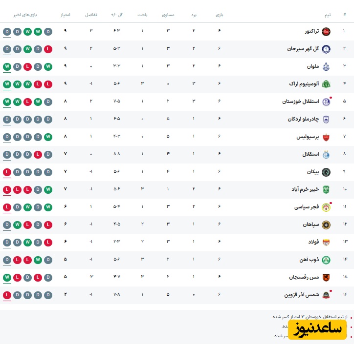 به گزارش سرویس ورزش ساعدنیوز، با پایان هفته ششم لیگ برتر فوتبال ایران، تراکتور با تفاضل گل بهتر در صدر جدول ایستاده اما رقابت در میان تیمهای بالانشین بهشدت فشرده است؛ شش تیم اول جدول تنها با یک امتیاز اختلاف در تعقیب یکدیگرند. در حالی که پرسپولیس و استقلال هنوز از روزهای اوج خود فاصله دارند و بیشتر به تساوی رضایت دادهاند، تیمهایی چون آلومینیوم و استقلال خوزستان با روندی روبهرشد در حال شگفتیسازی هستند. این نتایج نوید فصلی غیرقابل پیشبینی و پرهیجان را در فوتبال ایران میدهد.