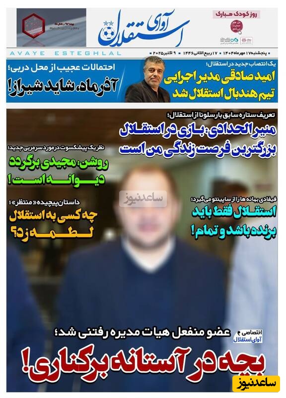 ساعدنیوز: در روز پنجشنبه 17 مهر 1404، روزنامه‌های کشور با عناوین مختلف به مهم‌ترین رویدادهای ورزشی، اجتماعی و سیاسی پرداخته‌اند. از تحولات جدید در عرصه‌های مختلف تا واکنش‌ها به اتفاقات روز، این عناوین نمایانگر دغدغه‌های جامعه در این روزها هستند.