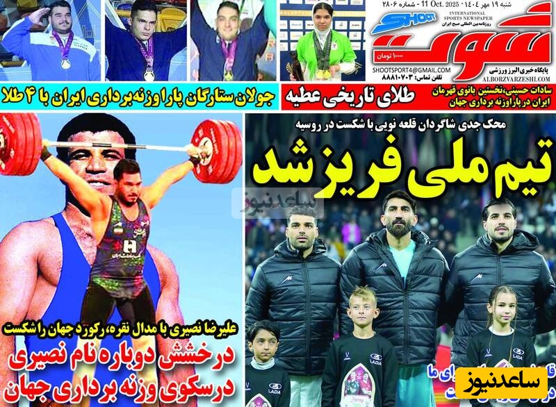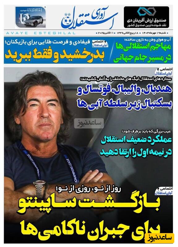 ساعدنیوز: در روز شنبه 19 مهر 1404، روزنامه‌های کشور با عناوین مختلف به مهم‌ترین رویدادهای ورزشی، اجتماعی و سیاسی پرداخته‌اند. از تحولات جدید در عرصه‌های مختلف تا واکنش‌ها به اتفاقات روز، این عناوین نمایانگر دغدغه‌های جامعه در این روزها هستند.