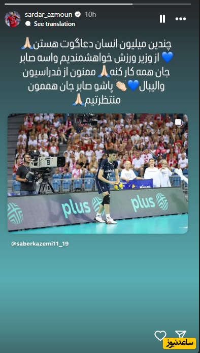اکنون سردار آزمون، مهاجم تیم ملی فوتبال ایران با انتشار پیامی با درخواستی از وزیر ورزش در صفحه شخصی اینستاگرامش نوشت: چندین میلیون انسان دعاگوت هستن . از وزیر ورزش خواهشمندیم واسه صابر جان همه کار کنه و ممنون از فدراسیون والیبال پاشو صابر جان هممون منتظرتیم.