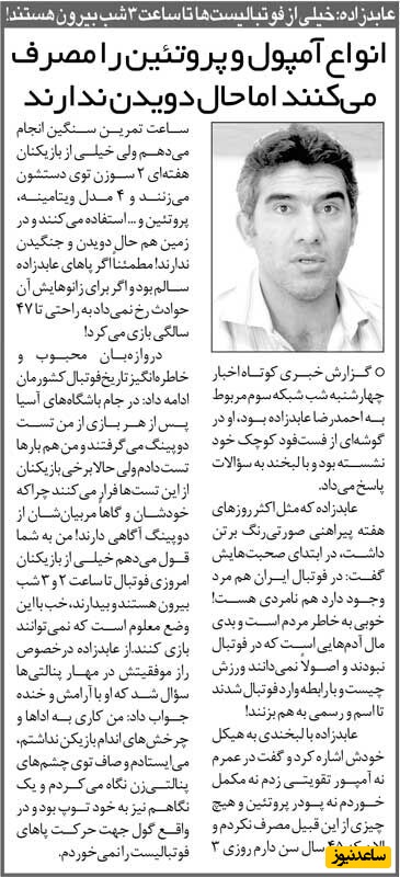ساعدنیوز: احمدرضا عابدزاده حدود 14 سال قبل با صراحت مدعی شد بعضی از فوتبالیست‌های کشورمان دوپینگی هستند.