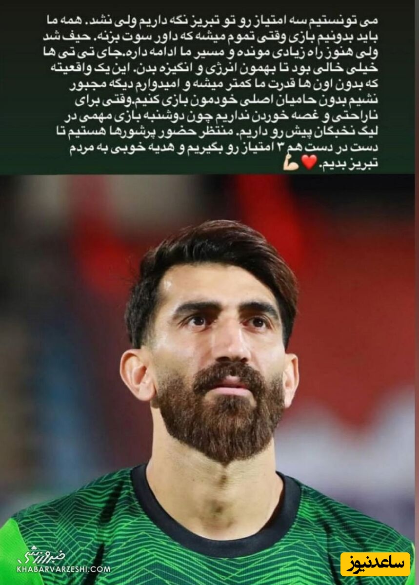 به گزارش سرویس ورزش ساعدنیوز، علیرضا بیرانوند دروازه بان تیم تراکتور تبریز بعد تساوی با پرسپولیس در بازی دیشب با انتشار استوری ای در صفحه شخصی اینستاگرامش برای تی تی ها پیامی نوشت: