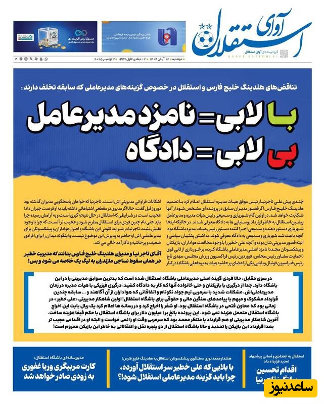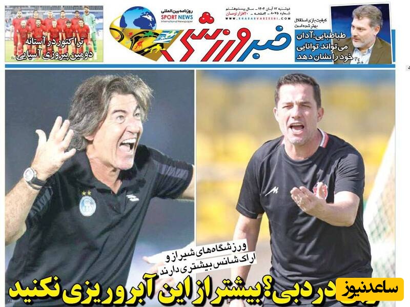 ساعدنیوز: در روز دوشنبه 12 آبان 1404، روزنامه‌های کشور با عناوین مختلف به مهم‌ترین رویدادهای ورزشی، اجتماعی و سیاسی پرداخته‌اند. از تحولات جدید در عرصه‌های مختلف تا واکنش‌ها به اتفاقات روز، این عناوین نمایانگر دغدغه‌های جامعه در این روزها هستند.