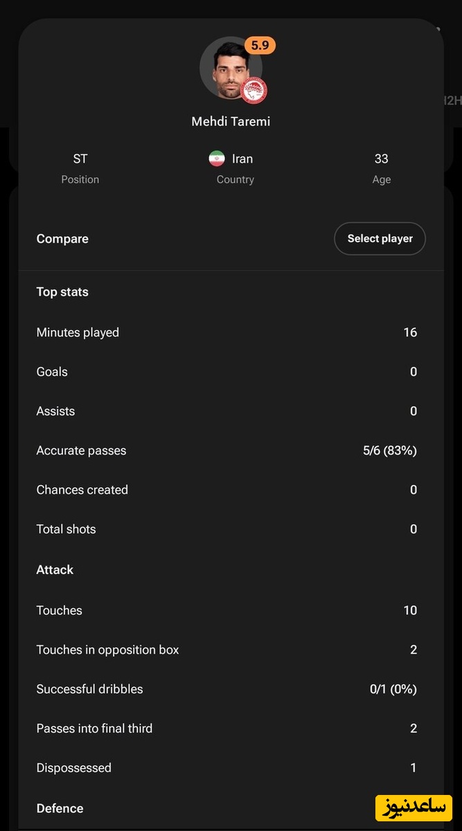 طارمی در نهایت نمره نه چندان خوب 5.9 را گرفت.