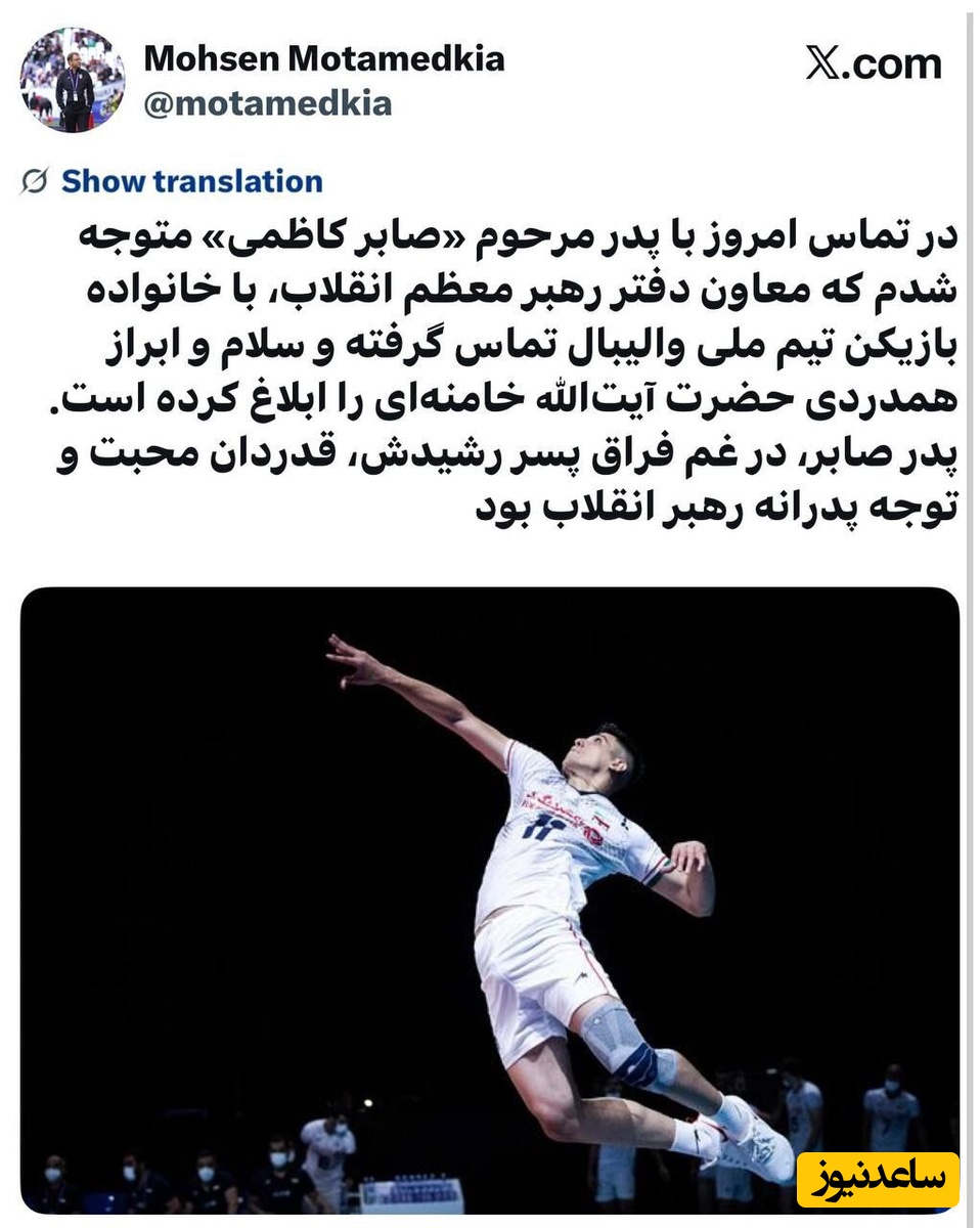«در تماس امروز با پدر مرحوم صابر کاظمی، متوجه شدم که معاون دفتر رهبر معظم انقلاب با خانواده بازیکن تیم ملی والیبال تماس گرفته و سلام و ابراز همدردی حضرت آیتالله خامنهای را ابلاغ کرده است. پدر صابر، در غم فراق پسر رشیدش، قدردان محبت و توجه پدرانه رهبر انقلاب بود.»