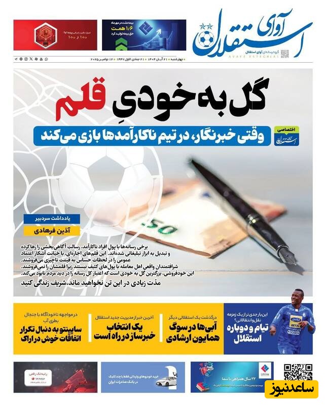 ساعدنیوز: در روز چهارشنبه 21 آبان 1404، روزنامه‌های کشور با عناوین مختلف به مهم‌ترین رویدادهای ورزشی، اجتماعی و سیاسی پرداخته‌اند. از تحولات جدید در عرصه‌های مختلف تا واکنش‌ها به اتفاقات روز، این عناوین نمایانگر دغدغه‌های جامعه در این روزها هستند.