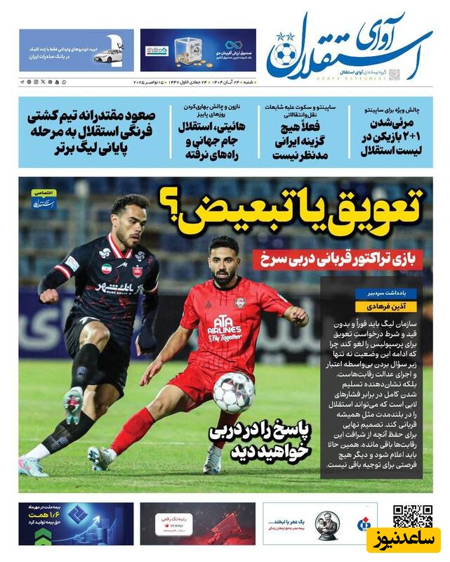 ساعدنیوز: در روز شنبه 24 آبان 1404، روزنامه‌های کشور با عناوین مختلف به مهم‌ترین رویدادهای ورزشی، اجتماعی و سیاسی پرداخته‌اند. از تحولات جدید در عرصه‌های مختلف تا واکنش‌ها به اتفاقات روز، این عناوین نمایانگر دغدغه‌های جامعه در این روزها هستند.