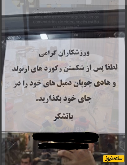 او تابلویی نصب کرده که از ورزشکاران میخواهد «بعد از شکستن رکوردهای آرنولد، دمبلها را سر جای خود بگذارند». همین جمله هنرآمیز و کنایهآلود باعث شده عکس این تابلو در شبکههای اجتماعی دستبهدست بچرخد و موجی از خنده و همذاتپنداری ایجاد کند؛ چون بعید است ایرانی باشی و این را ببینی و نخندی!