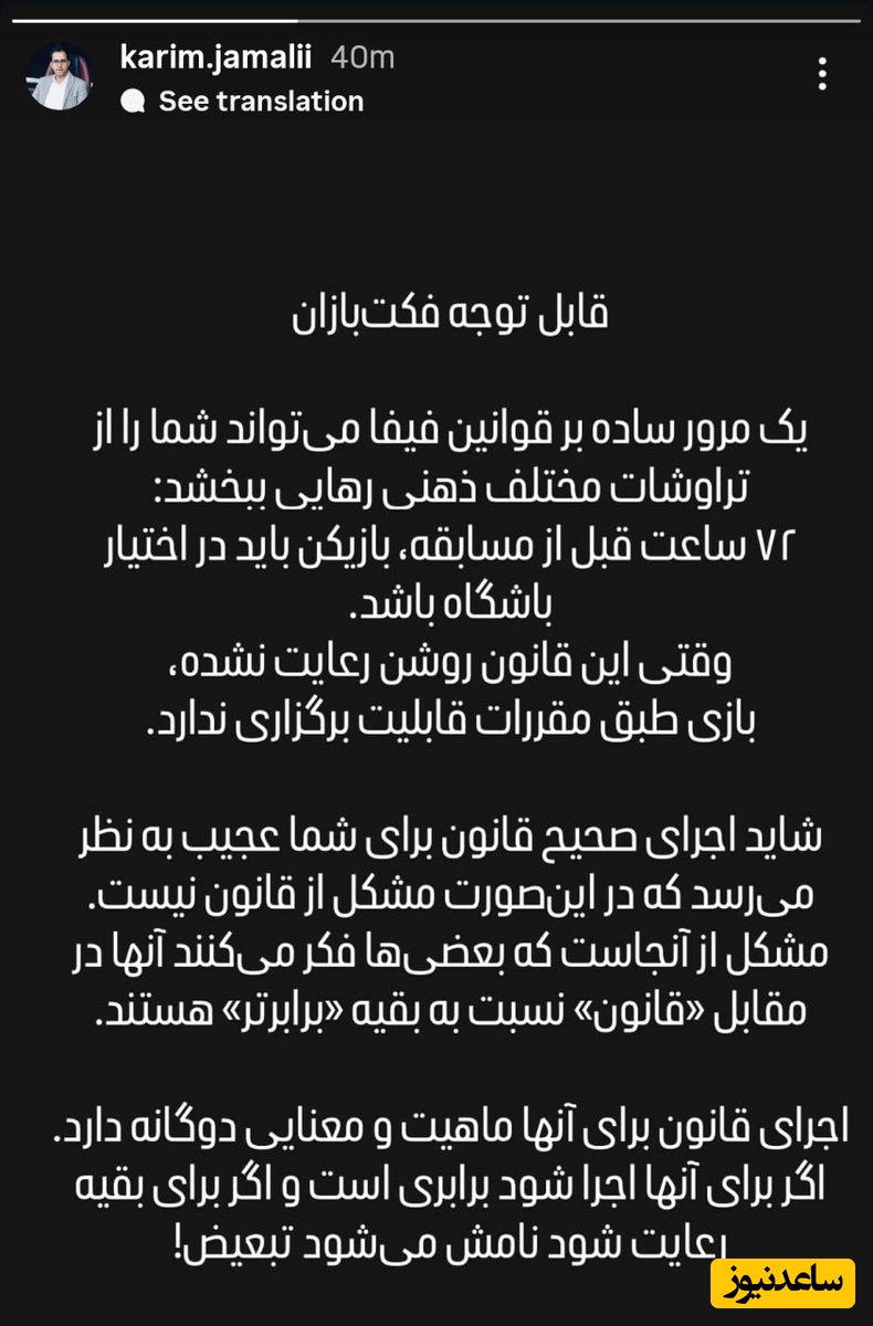 کریم جمالی مدیررسانه ای باشگاه تراکتور در این خصوص با تیتر «قابل توجه فکتبازان» نوشته است: «یک مرور ساده بر قوانین فیفا میتواند شما را از تراوشات مختلف ذهنی رهایی ببخشد: 72 ساعت قبل از مسابقه، بازیکن باید در اختیار باشگاه باشد. وقتی این قانون روشن رعایت نشده، بازی طبق مقررات قابلیت برگزاری ندارد.»