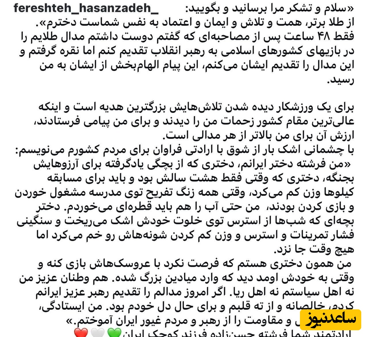 اما پیام رهبر معظم انقلاب به فرشته حسنزاده:«سلام و تشکر مرا برسانید و بگویید از طلا برتر، همت و تلاش و ایمان و اعتماد به نفس شماست دخترم»