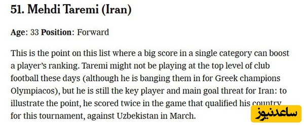 به گزارش سرویس ورزش ساعدنیوز، نشریه اتلتیک امروز(چهارشنبه) با بررسی 1200 بازیکن شرکت کننده در جام جهانی 2026 به معرفی 100 بازیکن برتر این تورنمنت پرداخت که مهدی طارمی، کاپیتان تیم ملی ایران در رده 51 ایستاد.طارمی به عنوان یکی از 4 ستاره فوتبال آسیا در لیست 100 نفر برتر جام جهانی در کنار 2 بازیکن ژاپنی(میتوما و کوبو) و یک بازیکن کره(سون) ایستاد.