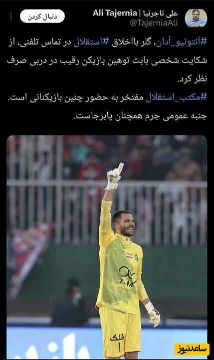 علی تاجرنیا رئیس هیئت مدیره و سرپرست مدیرعاملی باشگاه استقلال در صفحه مجازی خود نوشت: " آنتونیو آدان، گلر بااخلاق استقلال در تماس تلفنی، از شکایت شخصی بابت توهین بازیکن رقیب در دربی صرف نظر کرد.