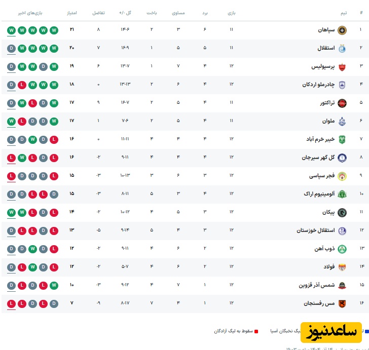 به گزارش سرویس ورزش ساعدنیوز، سپاهان با 6 برد، 3 مساوی و 2 باخت از 11 بازی و تفاضل گل مثبت 8 در صدر جدول ایستاده است. استقلال با 20 امتیاز از 11 بازی و تنها یک شکست در رتبه دوم قرار دارد و پرسپولیس با 19 امتیاز از 12 بازی جایگاه سوم را به خود اختصاص داده است. چادرملو اردکان با 18 امتیاز چهارم است و تراکتور و ملوان با 17 امتیاز در ردههای پنجم و ششم قرار دارند. فاصله امتیازی تیمهای بالانشین نشان میدهد رقابت در بالای جدول بسیار نزدیک و فشرده دنبال میشود.