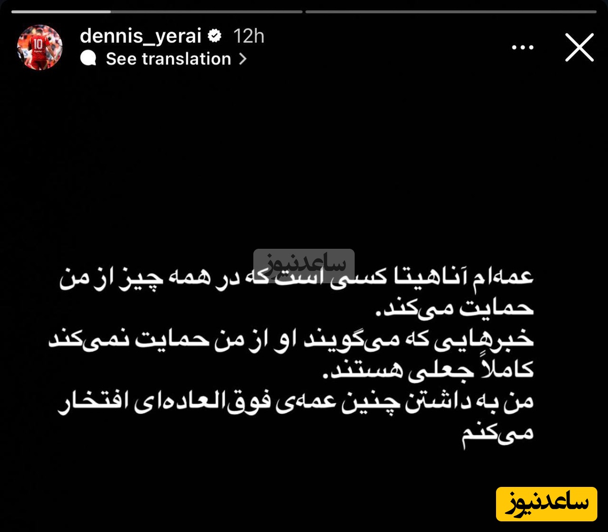دنیس اکرت با انتشار یک استوری اینستاگرامی که نوشتن آن با زبان فارسی جالب توجه بود، عنوان کرد: «عمهام آناهیتا کسی است که در همه چیز از من حمایت میکند. خبرهایی که میگویند او از من حمایت نمیکند، کاملا جعلی هستند. من به داشتن چنین عمهی فوقالعادهای افتخار میکنم.»