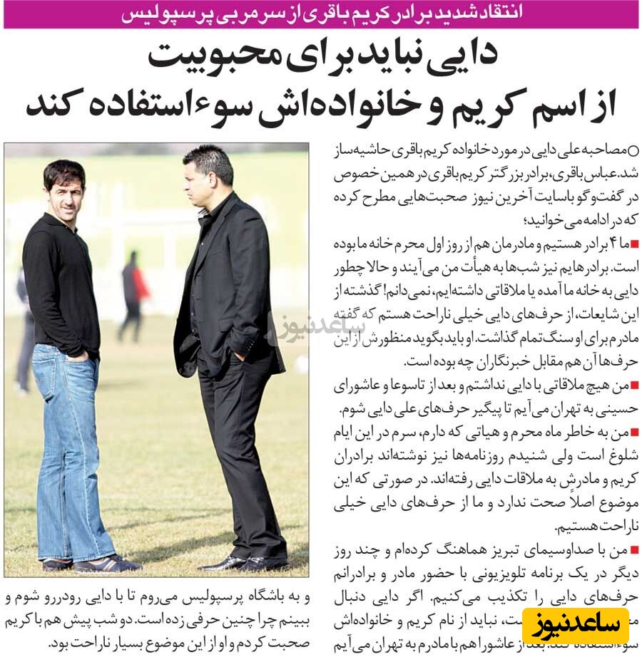 به گزارش سرویس ورزش ساعدنیوز، علی دایی بعد از اینکه کریم باقری قید حضور در پرسپولیس را زد، طی مصاحبهای که اواسط آذر سال 89 منتشر شد گفته بود با خانواده کریم باقری برای بازگشت او صحبت کرده اما این صحبت از سوی خانواده آقاکریم رد شد.