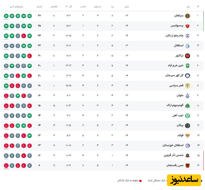 به گزارش سرویس ورزش ساعدنیوز، سپاهان با 27 امتیاز از 13 بازی و تنها 6 گل خورده، بهترین عملکرد را در جدول به ثبت رسانده است. پنج پیروزی متوالی نشان میدهد شاگردان این تیم در اوج آمادگی قرار دارند و فعلاً بخت اول قهرمانی محسوب میشوند.