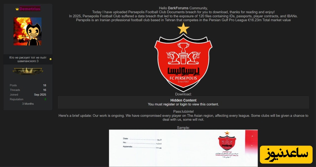 به گزارش سرویس ورزش ساعدنیوز، امروز در یکی از فرومهای اطلاعات هک شده، یک گروه ادعا کرد که با حمله سایبری به باشگاه پرسپولیس، اطلاعات مربوط به قراردادها و همچنین اعضای تیم و بازیکنان را به سرقت برده است. این ادعا به سرعت در فضای مجازی دست به دست شد و تعجب هواداران پرسپولیس را نیز به همراه داشت.