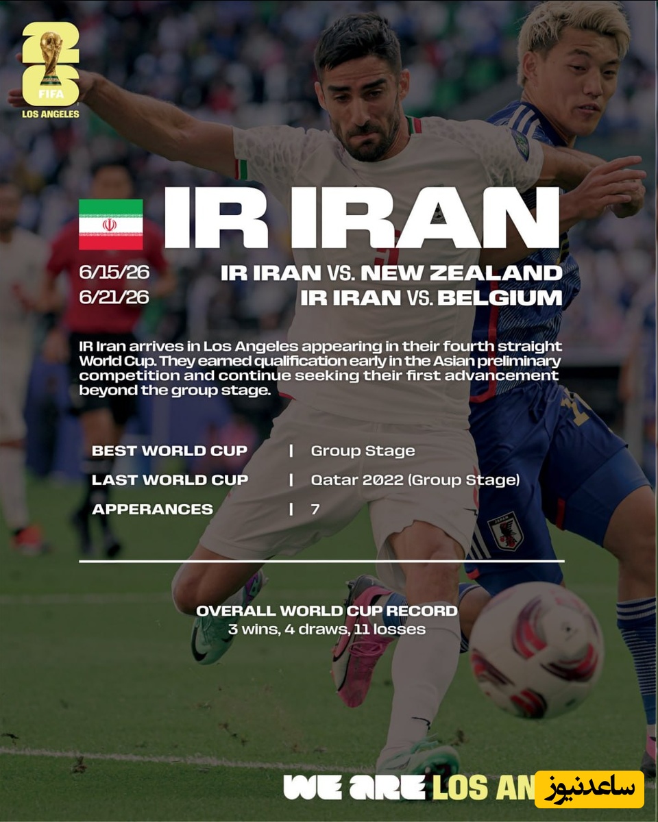 در آستانه این رقابتها، صفحه رسمی فیفا در لسآنجلس با انتشار پوستری نمادین، به حضور ایران خوشآمد گفت و به چهارمین صعود متوالی یوزهای ایرانی به جام جهانی و هدف تاریخیشان برای عبور از مرحله گروهی اشاره کرد. با توجه به جمعیت بالای ایرانیان در کالیفرنیا، پیشبینی میشود بازیهای ایران در لسآنجلس فضایی شبیه بازی خانگی داشته باشد؛ جایی که دیدارهای ایران با نیوزیلند و بلژیک برگزار میشود و بازی مقابل مصر در سیاتل خواهد بود.