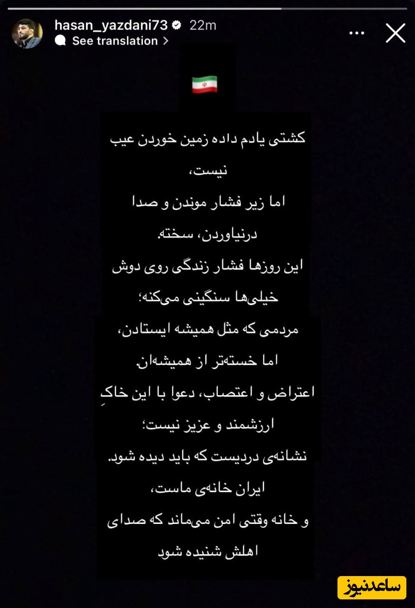 به گزارش سرویس ورزش ساعدنیوز، حسن یزدانی، ستاره کشتی ایران با انتشار یک استوری به اتفاقات روزهای اخیر و اعتراضات مردم واکنش نشان داد.