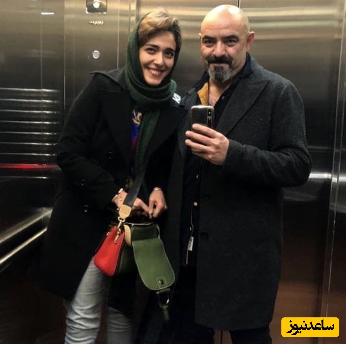 تصویری از حسن معجونی با همسرش در آسانسور را مشاهده می کنید.