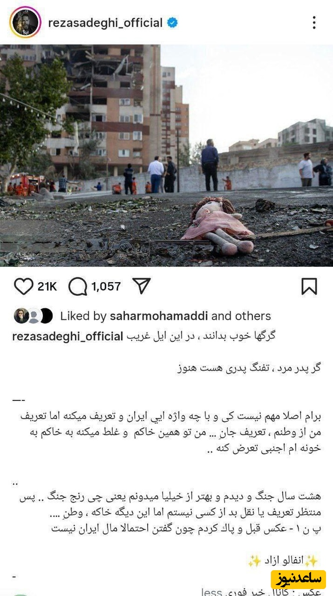 به گزارش سرویس هنر و رسانه پایگاه خبری ساعدنیوز، رضا با انتشار تصویر زیر به حمله اسرائیل به خاک ایران واکنش نشان داد:
