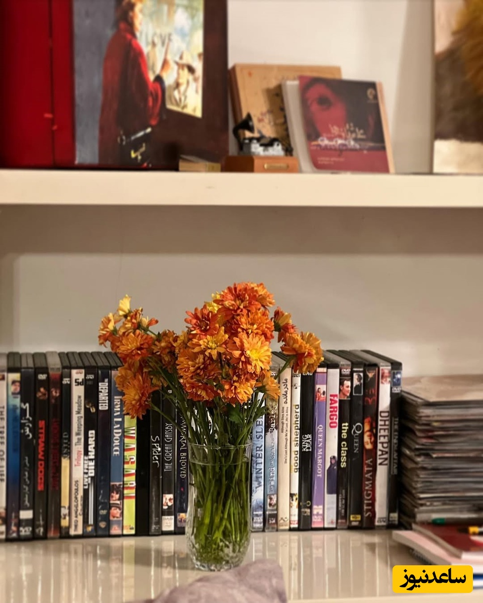 در بخش دیگر خانه، قفسهای پر از کتاب و فیلمهای سینمایی دیده میشود که نشاندهنده علاقه او به هنر و ادبیات است. قرار گرفتن گلهای تازه در کنار این قفسهها، حالتی شاعرانه و پرانرژی به فضا بخشیده و ترکیب زندگی روزمره با علاقهمندیهای فرهنگی را برجسته کرده است. این چیدمان، خانهای شخصی و پر از روح زندگی را به تصویر میکشد.