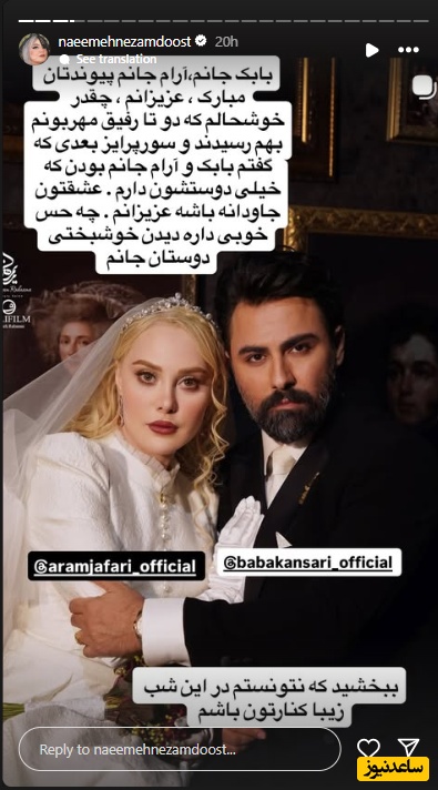 به گزارش سرویس هنر و رسانه پایگاه خبری_تحلیلی ساعدنیوز، آرام جعفری و بابک انصاری، بازیگران مطرح سینما و تلویزیون ایران، با انتشار پستی مشترک در صفحات رسمی خود در شبکههای اجتماعی، ازدواج خود را رسماً اعلام کردند. این خبر با استقبال گسترده طرفداران و همکاران هنری آنها مواجه شد و بسیاری از هنرمندان ضمن تبریک، برای این زوج خوشبخت آرزوی سعادت و خوشبختی کردند.