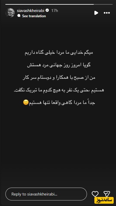 به گزارش سرویس هنر و رسانه ساعدنیوز، روز 19 نوامبر هر سال بعنوان روز جهانی مردان شناخته می شود. این روز به روایتی از سال 1992 به ابتکار پرفسور توماس آستر نامگذاری شده است و از سال 1999 به شکل فراگیرتر در آمد و هر سال به تعداد کشورهایی که این مناسبت جهانی را برگزار می کنند افزود شد آنچنان که هم اکنون در بیش از 60 کشور جهان روز جهانی مردان برگزار می شود. تصاویری از استوری بازیگران به مناسبت روز جهانی مرد را ملاحظه می کنید.