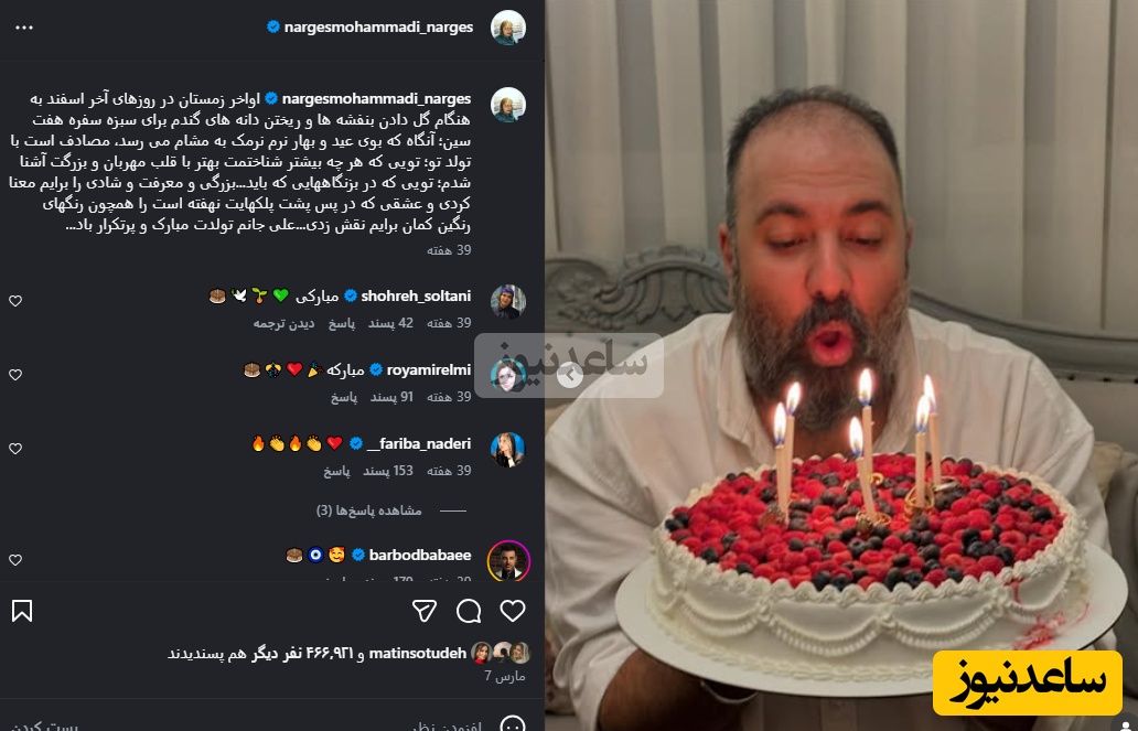 ساعدنیوز: تصویری از علی اوجی همسر نرگش محمدی را مشاهده می کنید که نرگس بانو در صفحه اینستاگرامش منتشر کرده بود.