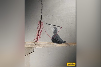 یک دروازه فلزی خمیده به شکلی درآمده که انگار سگی از میان آن پریده است. روی میلههای کج، تابلوی «مراقب سگ باشید» به شکل طنزآمیز آویزان شده است.