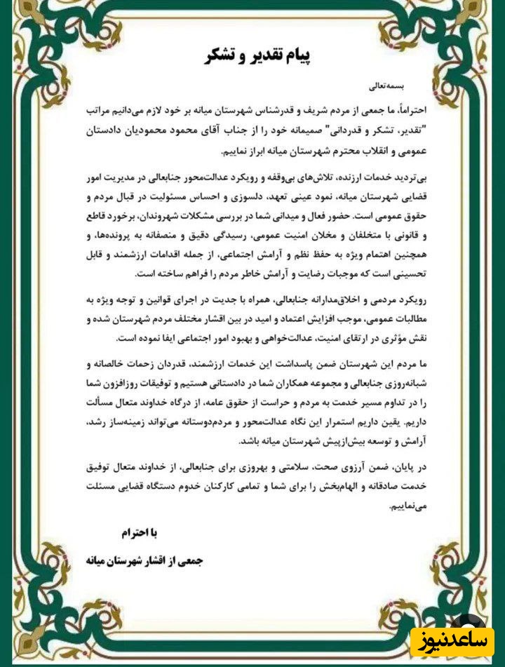 به گزارش سرویس خبرباتو ساعدنیوز، این مراسم نشاندهنده قدردانی و حمایت جامعه از اقدامات محمود محمودیان در راستای برقراری عدالت و حفظ حقوق شهروندان است. مردم میانه به وضوح احساس مسئولیت و تلاشهای ایشان را در تأمین امنیت و آرامش در جامعه خود، ارزشمند دانسته و از این طریق به رسمیت شناختند.