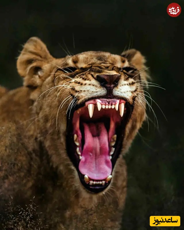 23. غرش شیر ماده: عکاسی حیاتوحش: دونال بوید، شیر ماده سرش را عقب میاندازد و با آروارههای گشوده و دندانهای نمایان غرش میکند. پسزمینه تیره شدت لحظه را افزایش داده و سلطه، هشدار و قدرت رامنشده طبیعت را نشان میدهد.