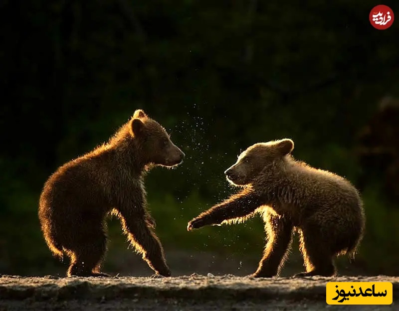 3. تولهخرسها در حال بازی: عکاسی حیاتوحش: اندی پارکینسون: دو تولهخرس جوان روبهروی هم ایستادهاند، در نور گرم پسزمینه و پنجههای کوچکشان بالا رفته، گویی در میانه کُشتی دوستانهاند. درخشش طلایی، غبار معلق و خز نرم را برجسته میکند و این تعامل بازیگوشانه را به صحنهای دلنشین در طبیعیترین شکلش بدل میکند.