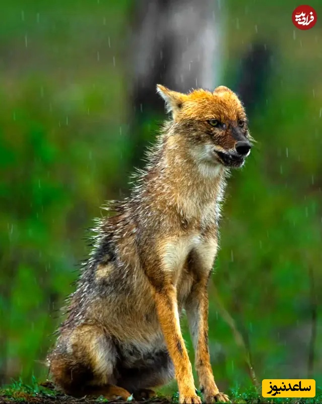 18. سگ وحشی در باران: عکاسی حیاتوحش هند: آشوک سیکری، سگ وحشیِ خیس زیر باران هوشیار نشسته در حالی که قطرات باران از قاب عبور میکنند، خزش خیس و نگاهش متمرکز است. پسزمینه سبز غنی و بارش باران، حالوهوایی دراماتیک ساخته که استقامت، شدت و بقاء در شرایط سخت را نشان میدهد.