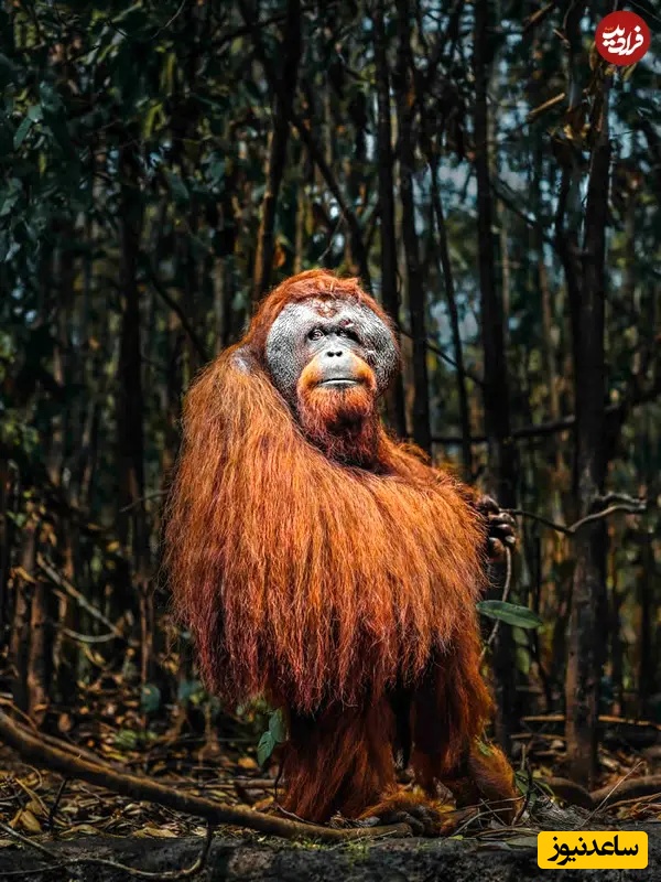 24. اورانگوتان در جنگل: عکاسی حیاتوحش: دونال بوید، اورانگوتان میان درختان انبوه آرام ایستاده، خز بلند سرخفامش در برابر پسزمینه تاریک جنگل جاریست. حالت متفکرانه و محیط طبیعی، قاب قدرتمندی ساخته که هوش، تنهایی و پیوند عمیق میان حیاتوحش و زیستگاه را ثبت میکند.