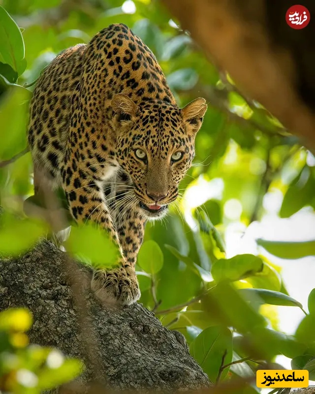 19. پلنگ روی تاج درخت: عکاسی حیاتوحش هند: آشوک سیکری، پلنگ با دقت روی شاخه درخت حرکت میکند، چشمها ثابت و بدن آماده حفظ تعادل است. این لحظه میان برگهای سبز انبوه ثبت شده؛ لحظه کمین، تمرکز و ظرافت خام شکارچی در حرکت.